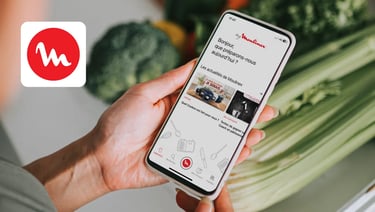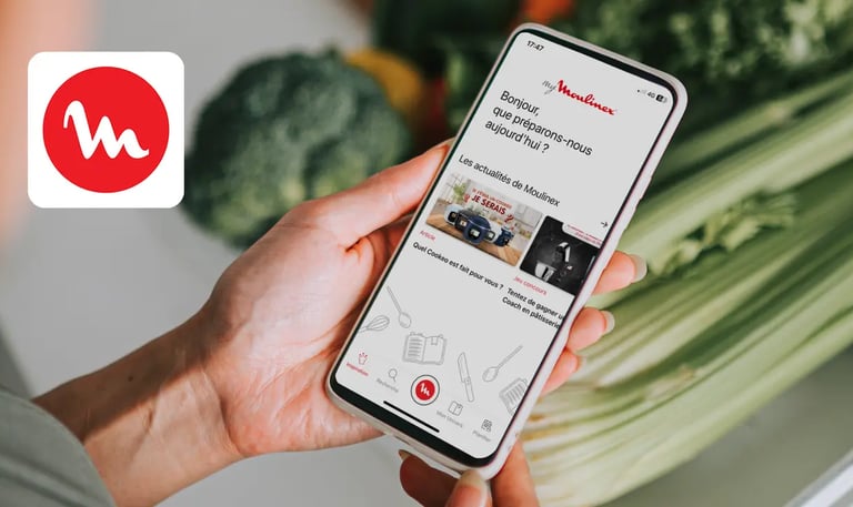 Application My Moulinex, trouver des idées recettes détaillées "pas à pas" selon les goûts de l'utilisateur, piloter les appareils Moulinex connectés et vente d'accessoires pour robots.